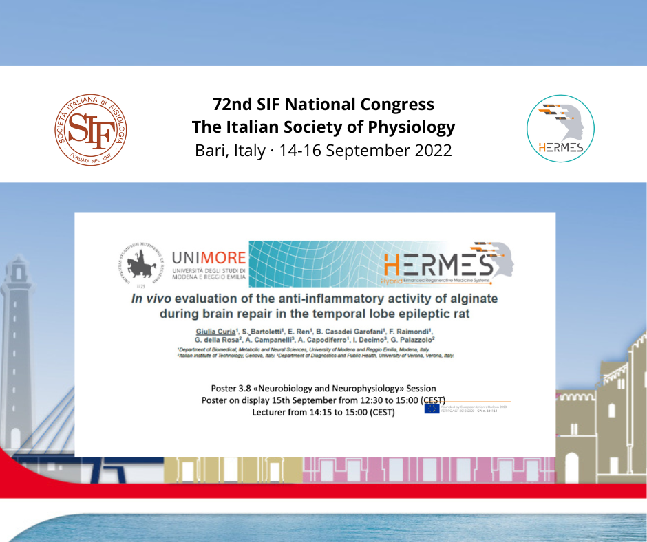A poster presentation based on HERMES investigation "In vivo evaluation of the anti-inflammatory activity of alginate during brain repair in the temporal lobe epileptic rat" was held at the 72nd SIF National Congress in Bari (IT) 14-16 September 2022.