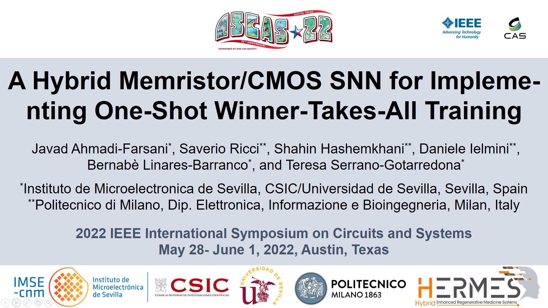Our consortium member CSIC presented “A Hybrid Memristor/CMOS SNN for Implementing One-Shot Winner-Takes-All Training” at ISCAS 2022 in Austin, Texas, during the session named “Recent Progress in Theory & Applications of Memristive Technologies Toward a New Era in Electronic IV” the was hold in presence.