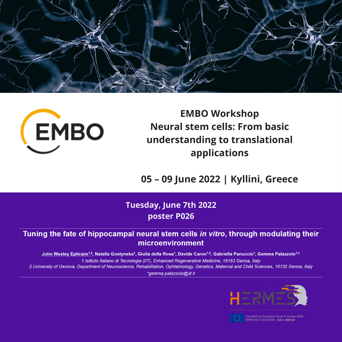We are proud to report PhD student John Wesley Ephraim from the Enhanced Regenerative Medicine research line at Istituto Italiano di Tecnologia attended the EMBO workshop “Neural Stem cells: from basic understanding to translational applications" that took place in Kyllini, Greece, 5 - 9 June 2022. He presented a poster based on HERMES investigation “Tuning the fate of hippocampal neural stem cells in vitro by modulating their microenvironment ”