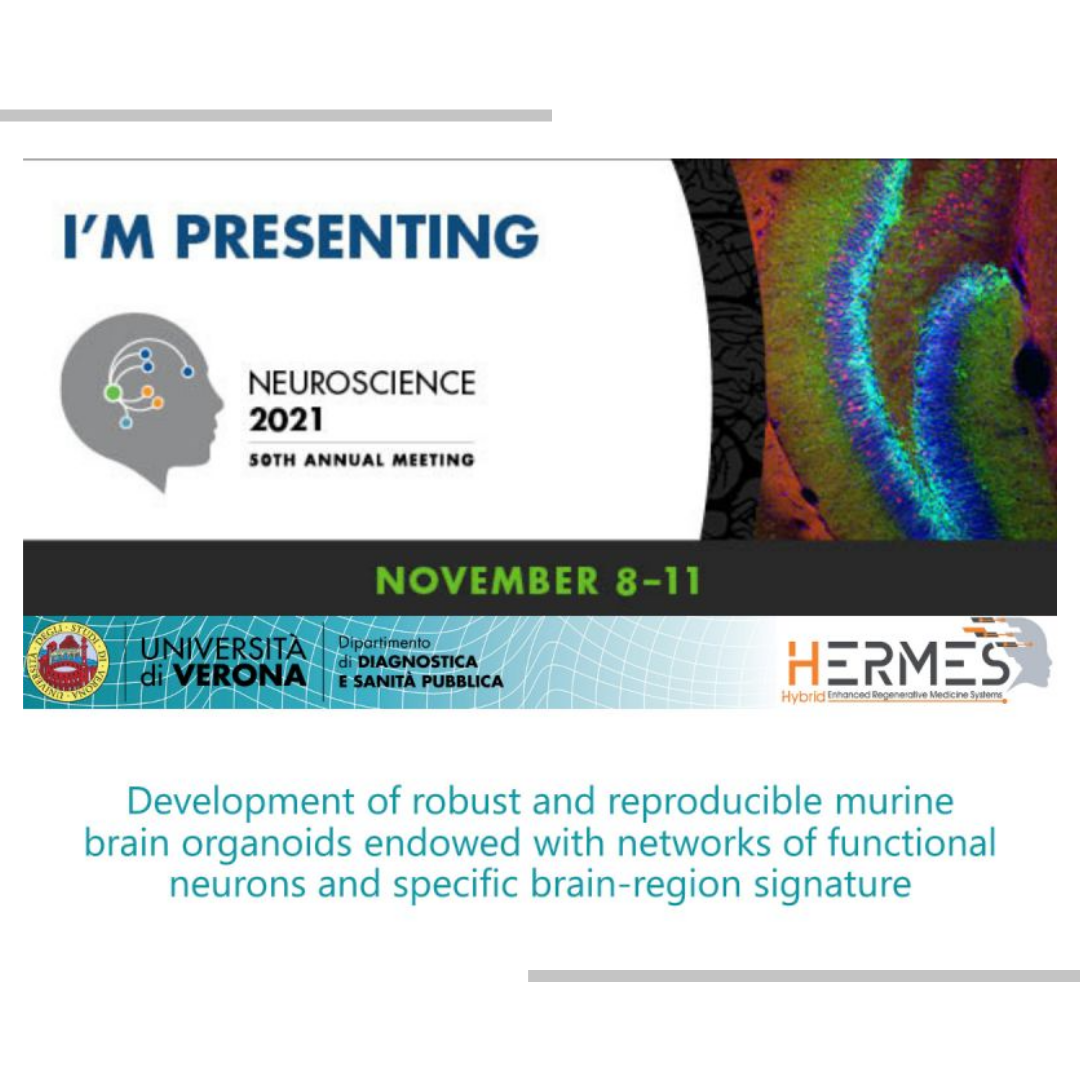 A presentation under the title "Development of robust and reproducible murine brain organoids endowed with networks of functional neurons and specific brain-region signature" by Dr. Francesca Ciarpella as representative of our consortium member Università degli Studi di Verona was held at the 50th Annual Meeting of Society for Neuroscience virtual edition November 8-11, 2021.