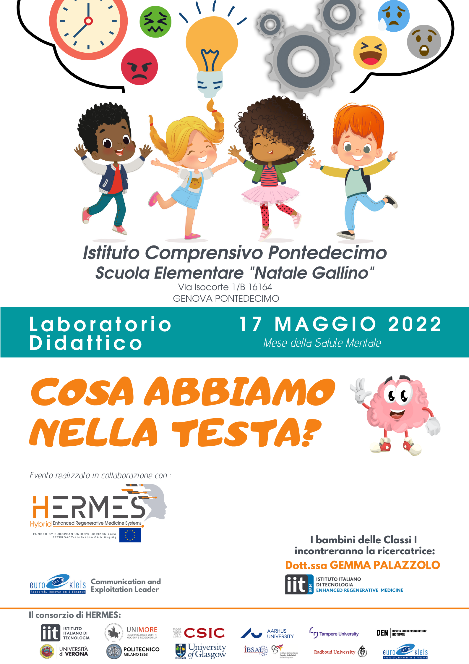 The idea of the educational workshop arises from the synergy between the researchers of the Istituto Italiano di Tecnologia, coordinator of the European research consortium HERMES, and the teachers of the primary school Natale Gallino in Genoa, who are highly committed to increase the knowledge of children and stimulate their curiosity together with the love for science. The mission of the HERMES project is the development of innovative systems to make brain regeneration possible. One of the objectives is to engage and raise awareness in the non-scientific community towards the fundamental role of science for improving brain health and therefore the quality of life, through advanced technologies of regenerative medicine. HERMES promotes dissemination and communication initiatives such as this laboratory thanks to the partner Eurokleis Srl that deals with communication activities and exploitation of the project results.