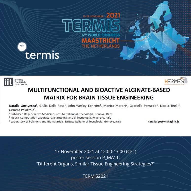 On Thu, 18th Nov - poster session “Biomaterials for soft tissue regeneration and disease modeling” Dr. Gemma Palazzolo presented "Magnesium-tailored alginate as a novel biopolymer for brain repair", a collaborative work between IIT - Laboratory of Enhanced Regenerative Medicine, Tissue Engineering Unit, Università degli Studi di Modena e Reggio Emilia and Università degli Studi di Verona , whose authors are Gemma Palazzolo, Giulia Della Rosa, Natalia Gostynska, Stefania Bartoletti, Elisa Ren, Giuseppina Leo, Ilaria Decimo, Nicola Tirelli, Giulia CURIA.